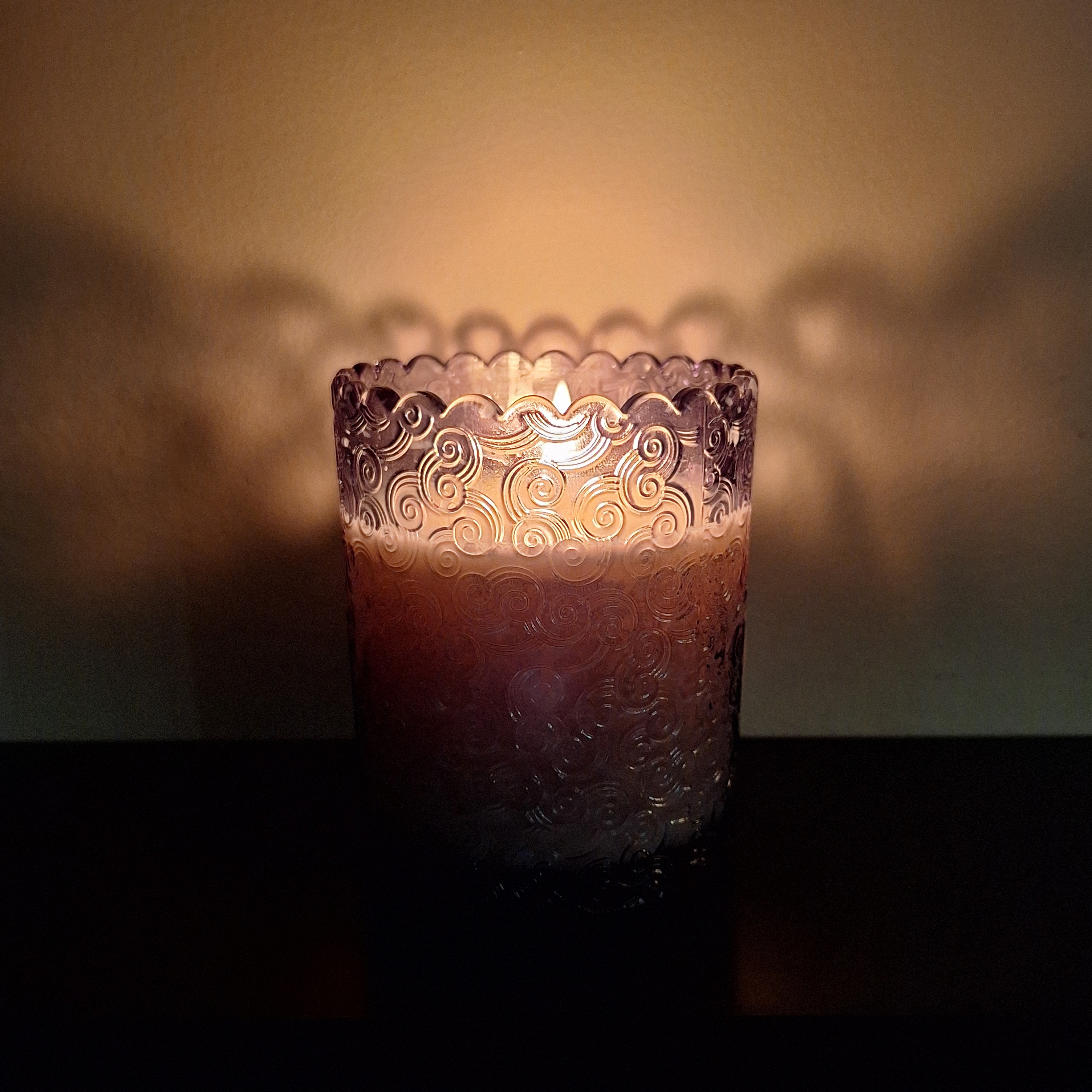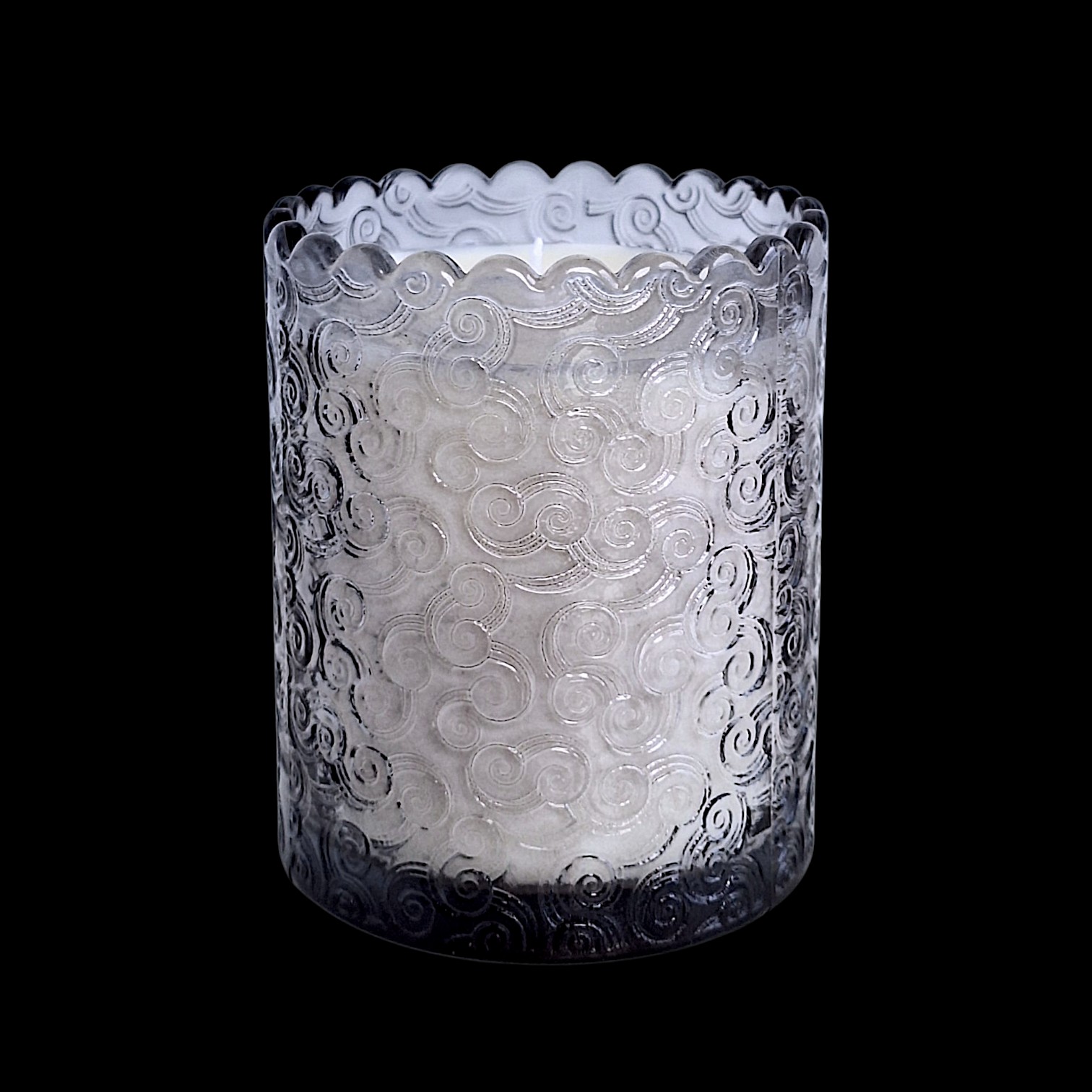 Add a touch of moody elegance to your space with a scented candle in this spiral-embossed candle jar. With its rich smoky grey hue and mesmerizing intricate embossed circular pattern, this jar blends texture and sophistication in one stunning piece. With its scalloped rim adding a refined silhouette, this jar will elevate any room, whether you're styling a cozy nook or setting the mood for a relaxing evening.