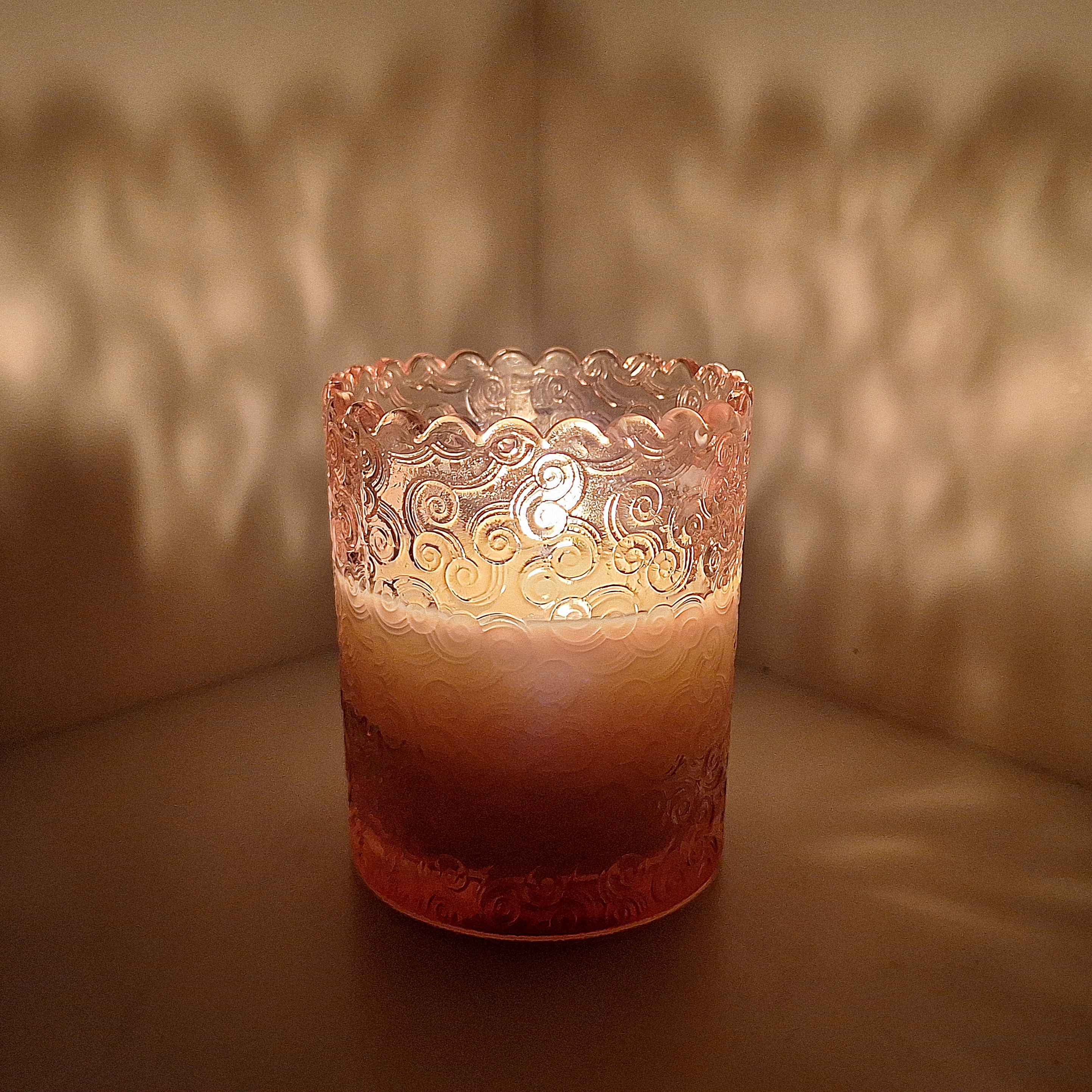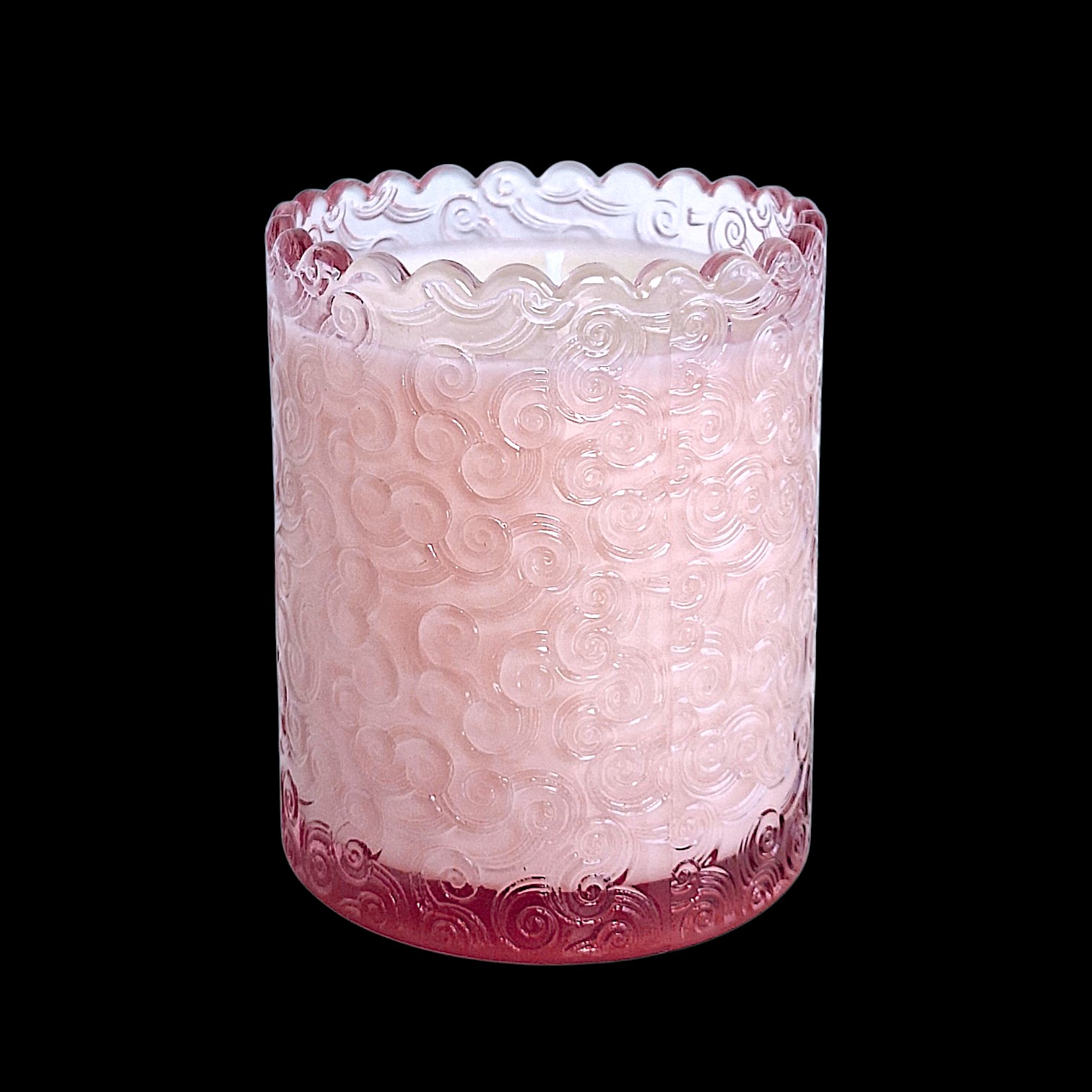 Add a touch of vintage charm and warm ambiance to your space with a scented candle in this spiral-embossed candle jar. The soft pink hue and mesmerizing intricate embossed circular pattern creates a gentle, inviting glow when the candle is burning. With its scalloped rim adding a refined silhouette, this jar will elevate any room, whether it’s used as an accent in a centrepiece or on its own.